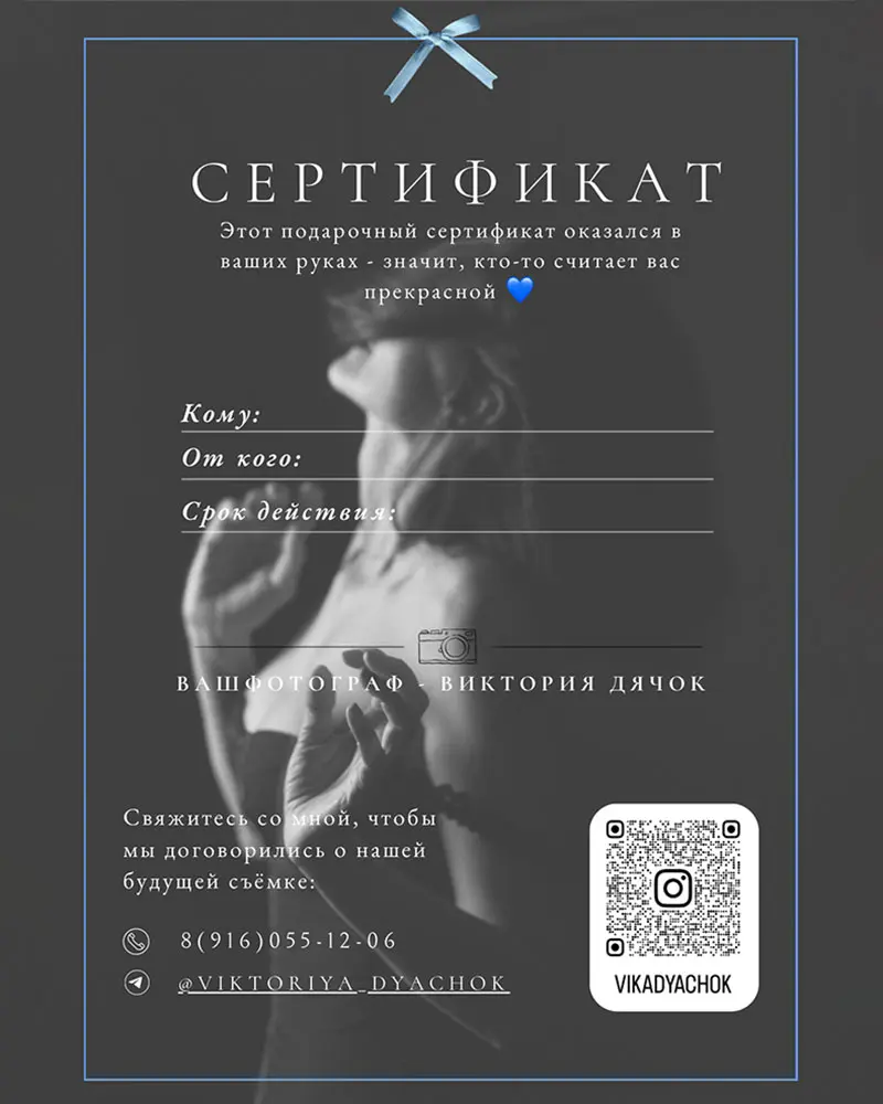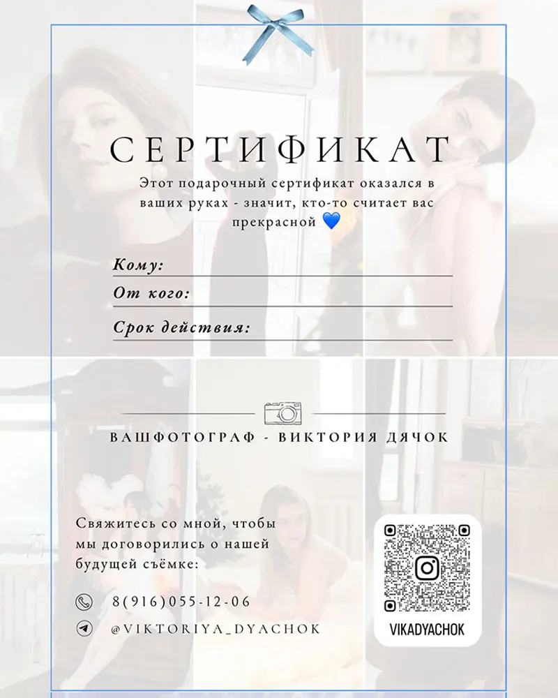 Сертификат на фотосессию от фотографа Виктории Дячок в Москве.